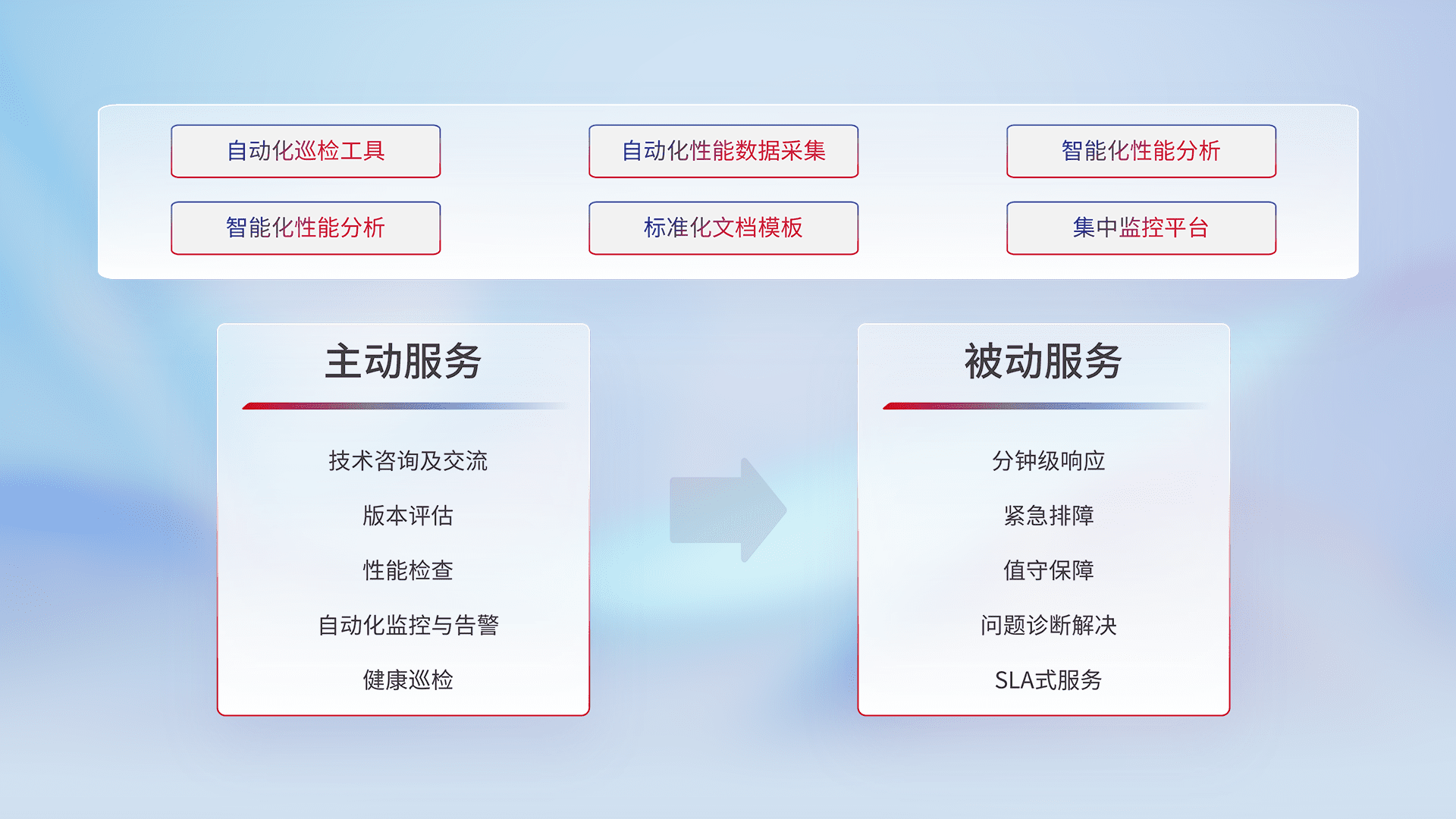 智能化工具和标准化文档,,保障服务质量,,提供主动服务(包含技术咨询、、版本评估、、、、性能检查、、、、自动化监控与告警、、健康巡检)和被动服务包含(分钟级响应、、紧急排障、、、、值守保障、、问题诊断解决、、、SLA服务)。。。。